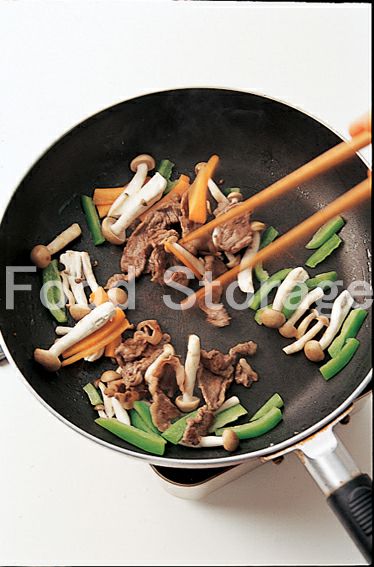 牛肉に火が通ったら、野菜類を加えて炒め合わせる。 |