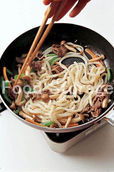 全体がしんなりしたらうどんを加えて炒め、しょうゆ、塩、こしょうで味を調える。 |