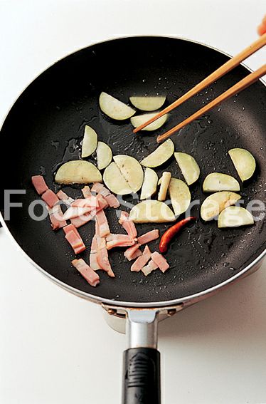 ベーコンは5mm幅に切り、なすは5mm厚さの半月切りにする。 |