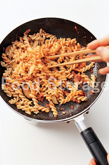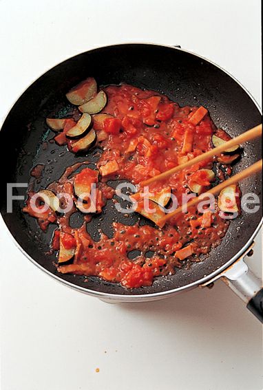 3がしんなりしたら、トマトソースを加えて軽く煮て、塩、こしょうで調味する。 |