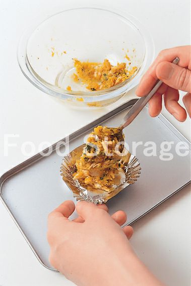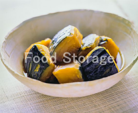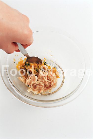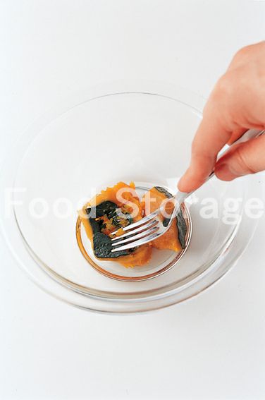 かぼちゃの煮ものはフォークなどで粗くつぶす。 |