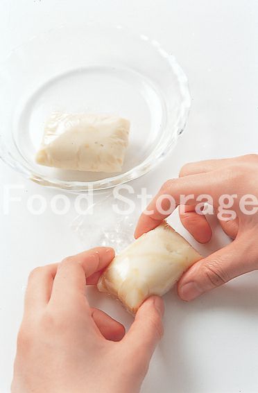 マカロニグラタンは2等分にしてそれぞれラップに包んで俵型にし、冷凍庫で1晩凍らせる。 |