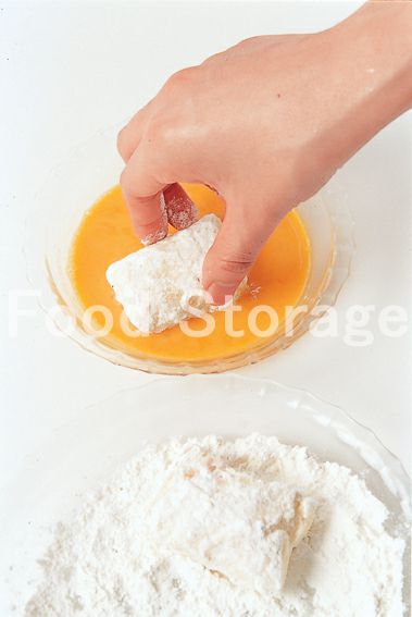 1のラップをはがし、薄力粉、溶き卵をつける。 |
