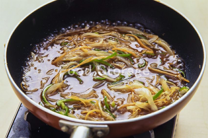 玉ねぎ、ピーマン、にんじんはせん切り、にんにく、しょうがはみじん切りにする。 |