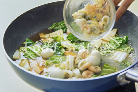 3のフライパンに残りのごま油を入れ、2を固いものから炒める。A、うずら卵を加え、ひと煮立ちしたら3を戻し入れて少し煮、水溶き片栗粉でとろみをつける。 |