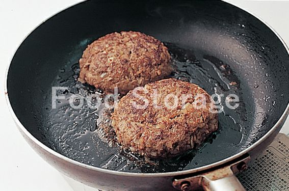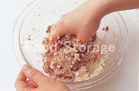 2の玉ねぎを1に加えてよく練り合わせ、4等分に分けて小判形に成形する。 |