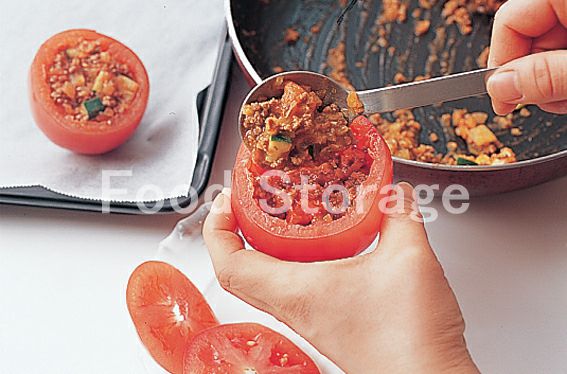1のトマトに4を入れ、粉チーズをかけて190℃のオーブンで15分ほど焼く。仕上げにパセリのみじん切りを散らす。 |