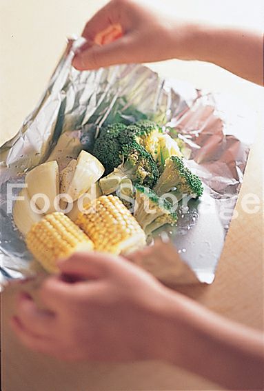 3にオリーブ油の半量、塩、こしょうをふってアルミホイルで包む。 |