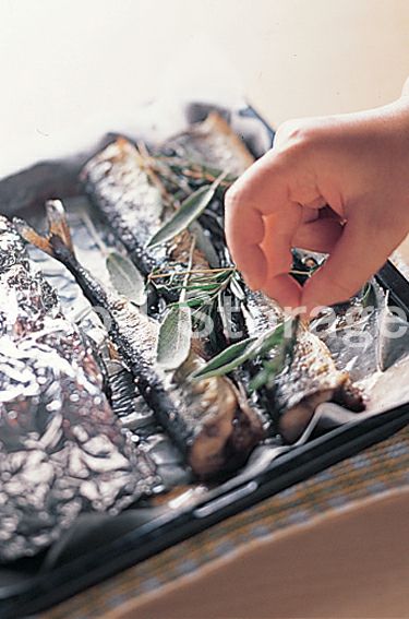 ハーブ類をのせ、さらに200℃のオーブンで5分焼く。器にさんまを盛り、野菜をアルミホイルから取り出して添える。 |