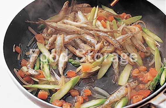 わかさぎ 塩 こしょう 薄力粉 揚げ油 トマト 玉ねぎ グリーンアスパラガス オリーブ油 A(酢 レモンの絞り汁 砂糖 塩 こしょう) チャービル