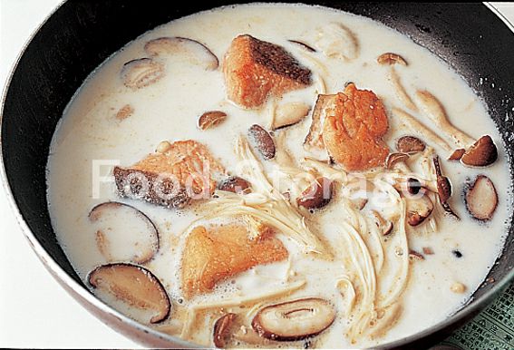 | きのこと、鮭だけのシンプルクリーム煮。生クリームではなく、スキムミルクと牛乳の、あっさりクリームがポイント。 |