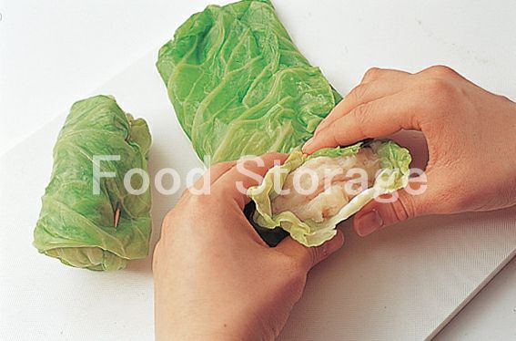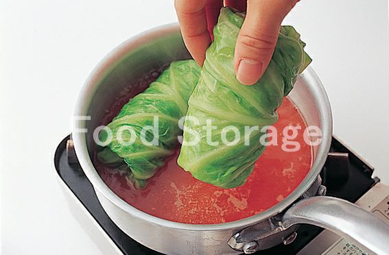 キャベツは芯のかたい部分は削いで薄くし、塩を加えた熱湯でゆでてからザルにあげて水けをきる。 |