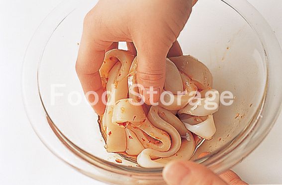 するめいかは内臓、骨を除いて洗い、皮をはがし、輪切りにする。 |