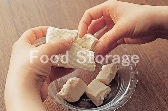 木綿豆腐は、ペーパータオルに包んで重しをし、しっかり水きりをし、食べやすい大きさに手でほぐす。 |