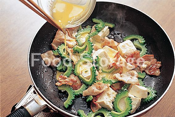 フライパンにサラダ油を熱して、2の豚肉を炒め、色が変わったらゴーヤー、1の豆腐、溶き卵を順に加えてその都度よく炒め合わせる。 |