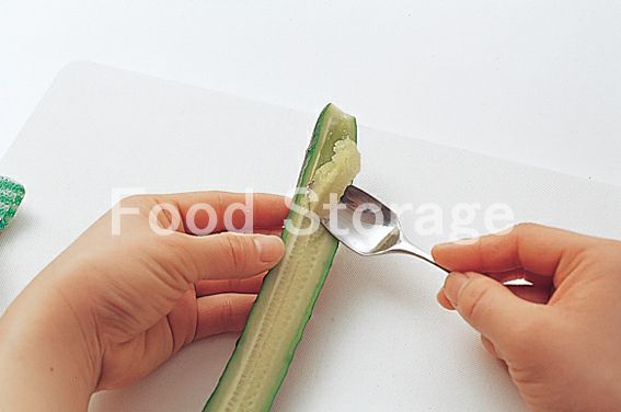 きゅうりは縦半分に切ってスプーンなどで種を取り除き、3cm幅に切る。パプリカは種を取り除いて乱切りにする。 |
