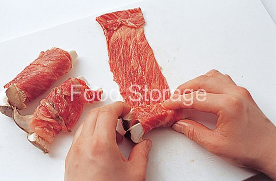 牛肉1枚にエリンギ2切れをのせて巻く。同様にあと5個作る。 |