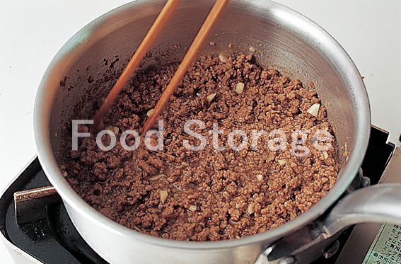 小鍋にサラダ油を熱し、2のにんにくを香りが出るまで炒め、牛ひき肉を加えてほぐしながら炒める。牛肉の色が変わったらAを加えて水けを飛ばしながら炒める。 |