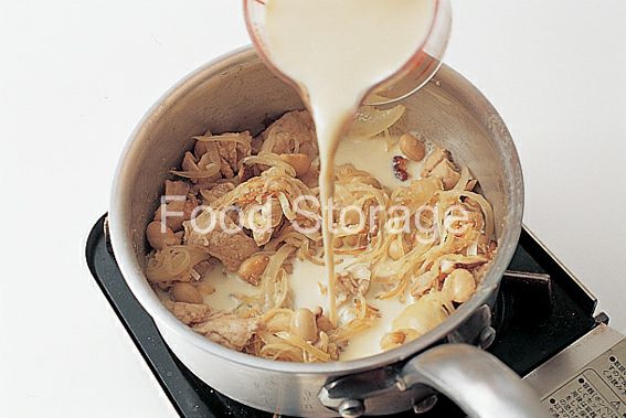 4.3に豆乳を少しずつ加え、とろみがつくまで煮詰めてしょうゆ、塩、こしょうで味を調える。