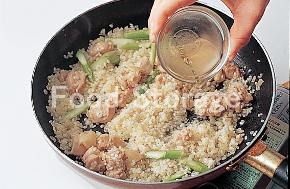 2にバター、洗った米を加えて炒め、米が透明になってきたら、アスパラガスを加えてさっと炒め合わせる。 |