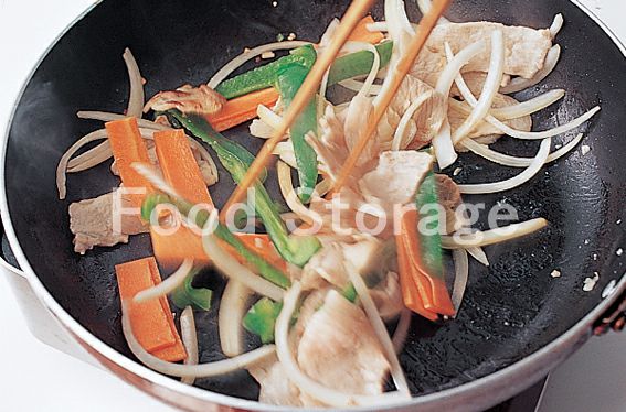 豚肉は3cm幅に切る。玉ねぎは薄切り、にんじんは4cm長さのたんざく切り、ピーマンは種とヘタを取って1cm幅に切る。にんにくはみじん切りにする。 |