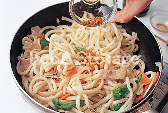 2にゆでうどんを加えて炒め合わせ、カレー粉、しょうゆ、塩、こしょうを加えて味を調える。 |