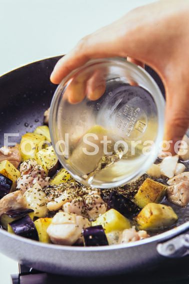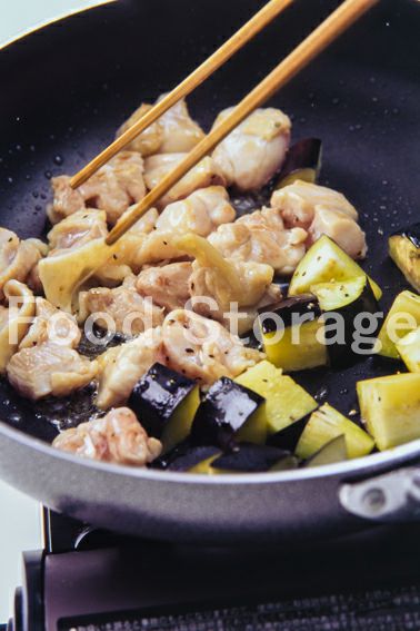 なす、鶏もも肉は1.5cm角に切り、鶏肉には塩、粗びき黒こしょうをしておく。にんにくは、包丁の腹でつぶす。 |