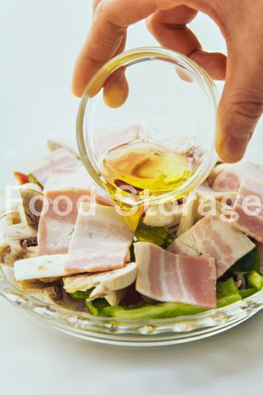 3.耐熱皿に1を入れて塩、こしょうふり、2のベーコンをその上にのせてオリーブ油を回しかけ、ラップをかけて電子レンジで2分加熱する。 |