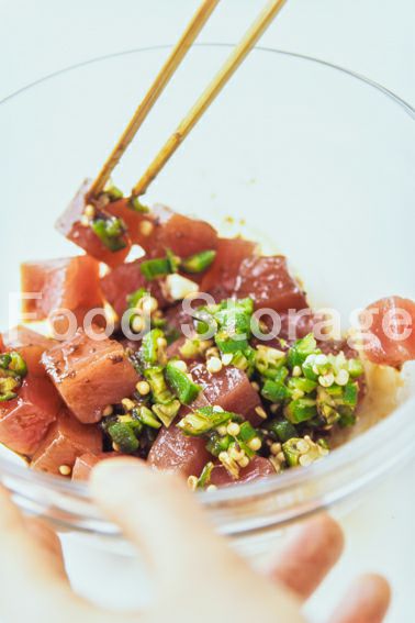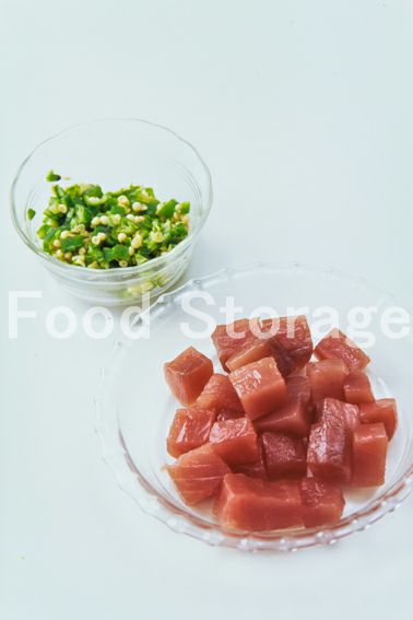 オクラは板ずりし、熱湯でさっとゆでて粗みじん切りにする。まぐろは1.5cm角に切る。 |