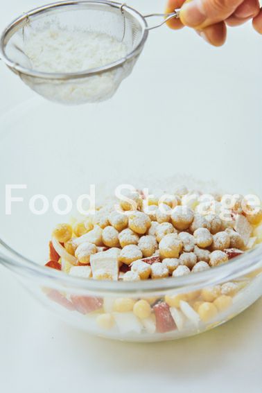 2.ボウルに1、小麦粉大さじ1(分量外)をふるい入れてさっくりと混ぜ合わせる。