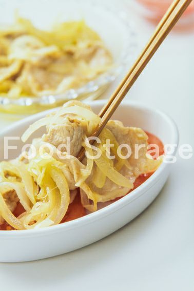 3.フライパンににんにく、オリーブ油を熱し、香りが出てきたら1の豚肉を色が変わるまで焼き、玉ねぎを加えてさっと炒め合わせる。
