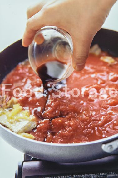 3に1の豚肉を加えて炒め、塩、こしょうし、つぶしたホールトマト、ウスターソースを加えて軽く煮込む。 |