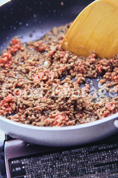 フライパンにごま油、1のにんにく、しょうがを熱し、香りが出たら牛ひき肉をほぐしながら炒め、Aを加えて炒め合わせる。 |