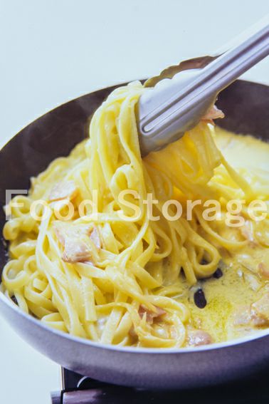 2のフライパンに3、4を加えて弱火にかけ、卵がかたまらないように絡め、塩、粗びき黒こしょうで調味する。 |
