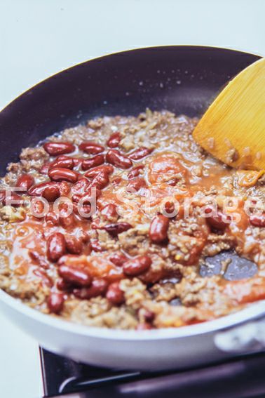 2に赤ワインを加えてアルコールを飛ばし、つぶしておいたホールトマト、キドニー豆を加えて汁気が2/3量になるまで煮つめる。 |