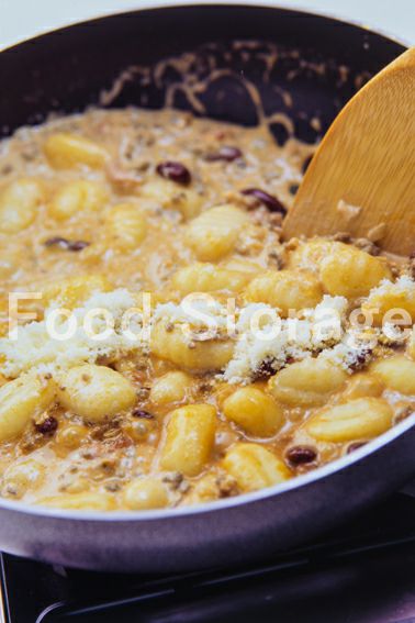 ニョッキ にんにく 玉ねぎ 合びき肉 バター 赤ワイン ホールトマト(缶詰) キドニー豆(缶詰) 生クリーム 顆粒コンソメの素 粉チーズ 塩 こしょう