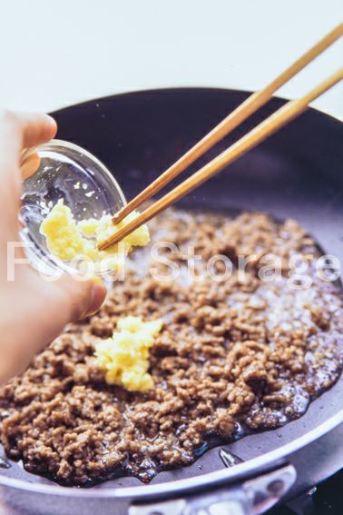 フライパンにサラダ油を熱し、豚ひき肉を色が変わるまで炒め、塩、こしょうして、しょうがを加えて炒め合わせる。 |