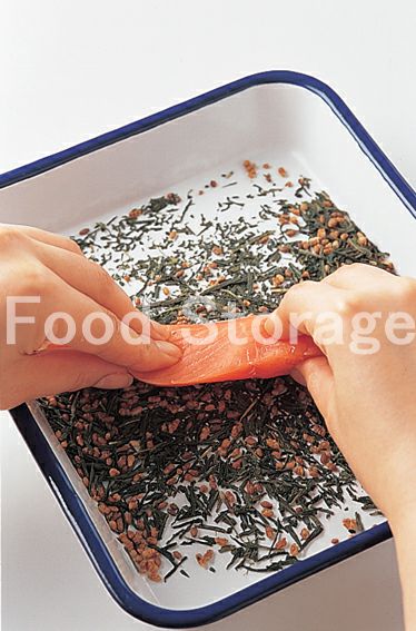 鮭に塩をふり、皮を取り除く。皮を取り除いた部分に小麦粉をまぶし、卵白にくぐらせて玄米茶をしっかりとつける。長ねぎは4cm長さのぶつ切りにする。 |