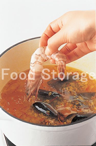 ムール貝は表面をこすり洗いして、ひげを取り除く。鯛は一口大に切る。えびは尾と頭を残して殻をむき、背ワタを取る。 |