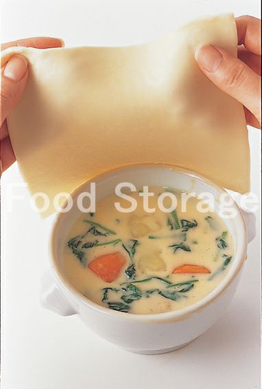 パイシートを厚さ3mmほどにのばして器よりひと回り大きく切り、4にかぶせ、縁をしっかりと押さえ密着させる。パイシートの表面にもBを塗り、200〜220℃に予熱したオーブンで12〜15分焼く。 |