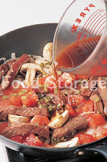 牛肉の色が半分ほど変わったら、トマト、ピクルスを加えてさっと炒める。Aを加え、中火にして3分ほど煮る。 |