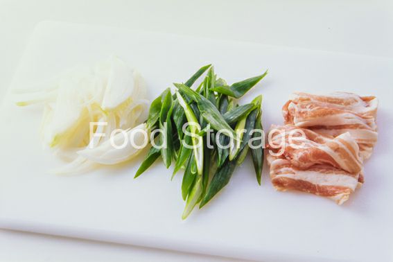 豚バラ薄切り肉は4等分に切り、玉ねぎは薄切り、わけぎは斜め切りにする。