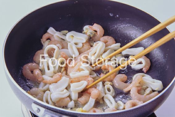 フライパンにごま油を熱し、おろししょうが、シーフードミックスを入れ、炒める。 |