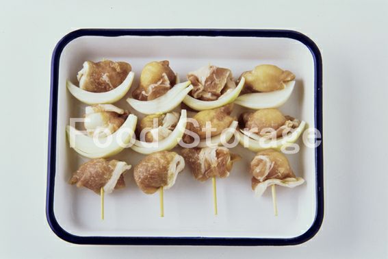 2.1の豚肉に水けをきったうずら卵をのせて巻き、玉ねぎと交互に3つずつ串に刺す。