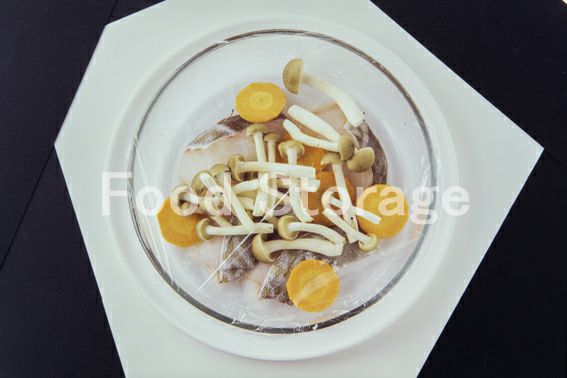 3.耐熱皿にたらを並べ、しめじ、にんじんをのせ、塩、酒をふってラップし、電子レンジ(600W)で4分加熱する。