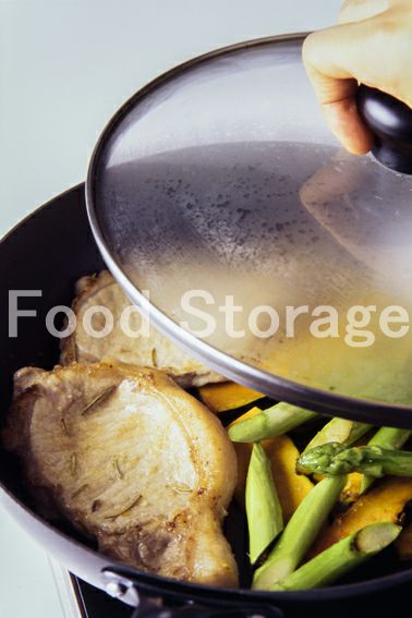 2.フライパンにオリーブ油を熱し、1の豚ロース肉を入れて両面に焼き色をつける。脇に1の野菜を加えて塩、こしょうしてさっと炒め、ふたをして蒸し焼きにして火を通す。 |