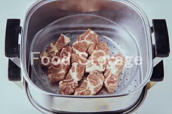 豚肩ロース肉は1.5cm幅に切って、塩、こしょう、酒をふって、耐熱皿にのせ、蒸気の上がった蒸し器で蒸し始める。 |