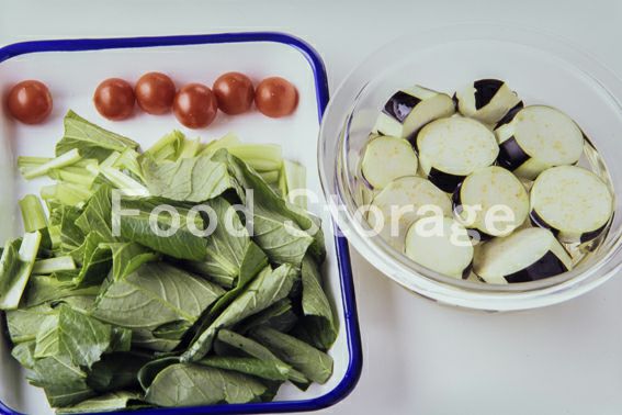 なすは縞模様に皮をむき、2cm幅の輪切りにし、水にさらしてアクを抜く。小松菜はざく切り、プチトマトはヘタを取り除く。 |