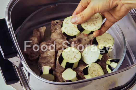 1を蒸し始めて3分たったところに、なすを加えて7分ほど蒸す。 |