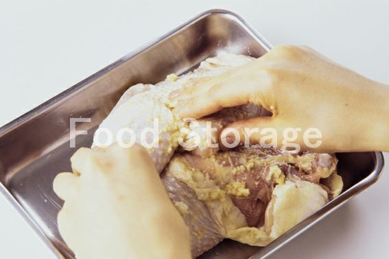 鶏もも肉は塩、こしょう、おろしにんにくをまぶし、少々おく。玉ねぎは1cm厚さの輪切りにする。 |